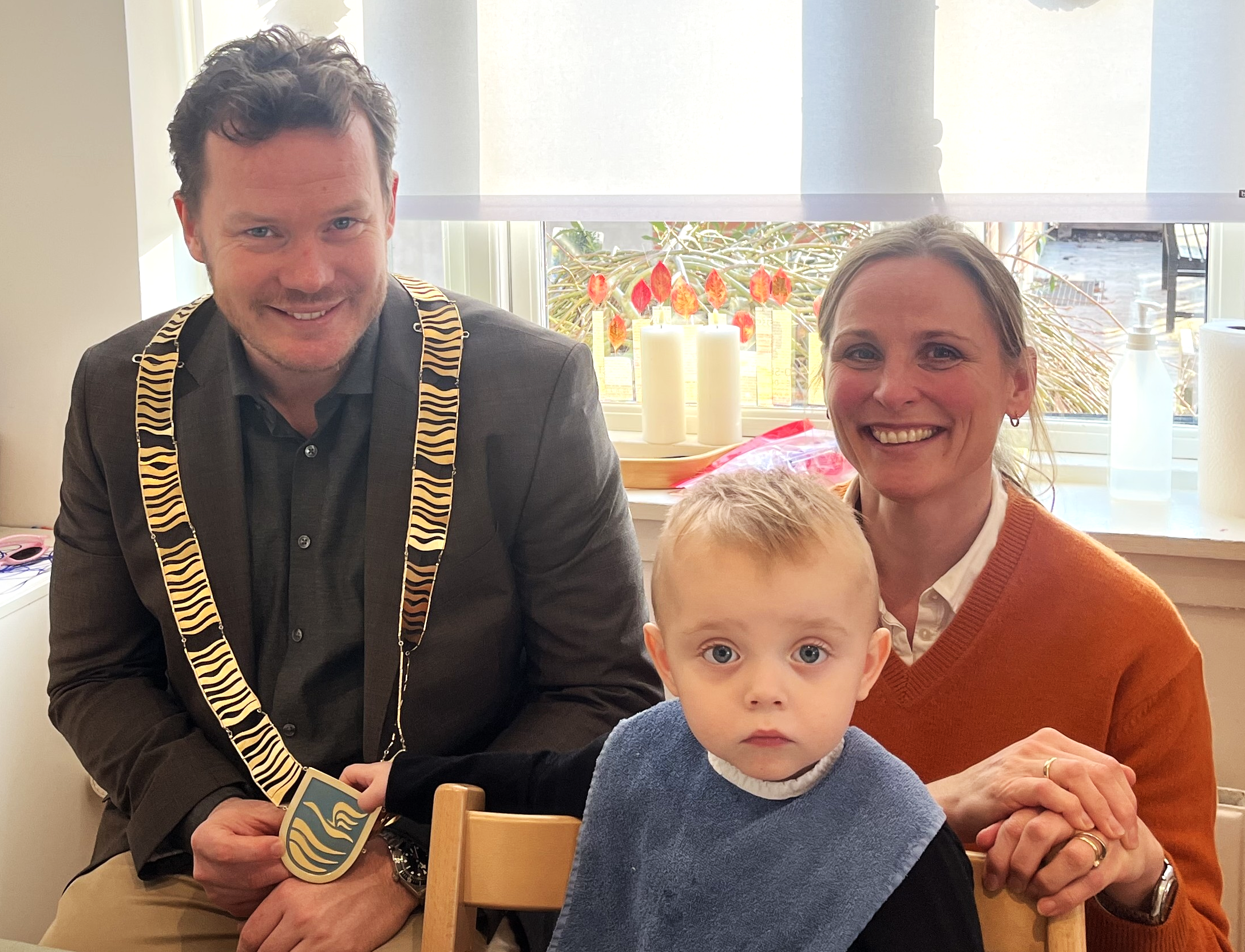 På billedet ses Furesø Kommunes borgmester, Nicolai Bisserup Bechfeldt, leder af Børnehuset Siv, Anja Riis Hofgaard og skønne lille Carlo.
